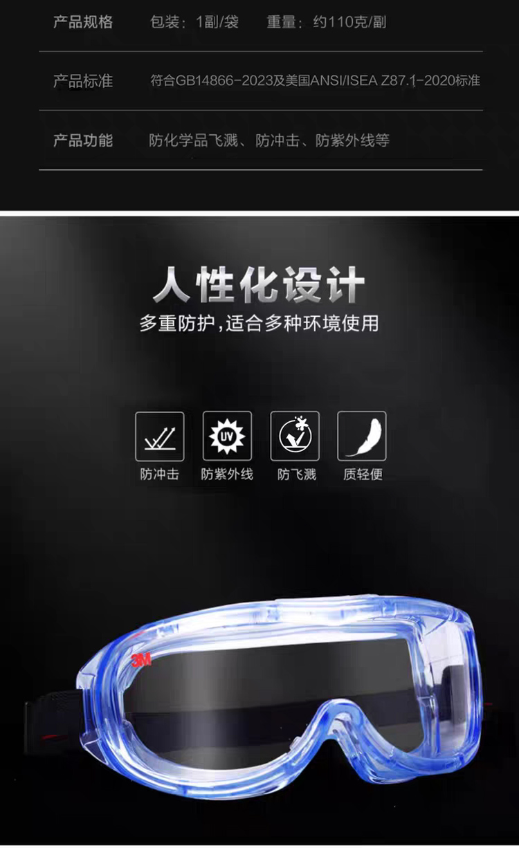 3M1621/1621AF/1623AF护目镜防尘风沙雾化学实验飞溅劳保防护眼镜